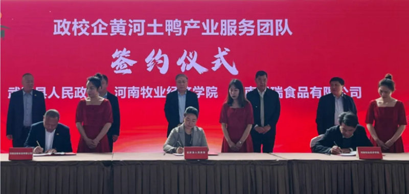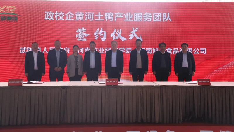 武陟縣政府副縣長蘇瑞君、河南牧業經濟學院副校長楊國宇、河南旭瑞食品有限公司副總經理邱國平為政校企三方共建“黃河土鴨”產業服務團隊簽約。三方將共同構建“政府+產業服務團隊+龍頭企業”服務合作模式,推動產科教融合發展。同時,河南牧業經濟學院將授予我們“百名專家助百村(企)工程服務基地”和“博士工作站”兩塊響亮的牌子,由12名專業博士為集團提供的技術創新支持。