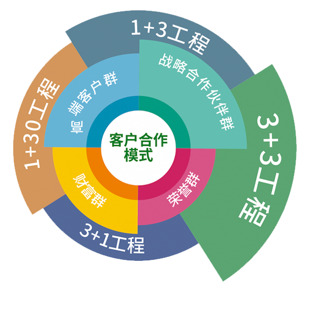 創(chuàng)新打造出獨特的“133-130”工程,圍繞(1+3工程、3+3工程、3+1工程、1+30工程)與客戶群(客戶群、財富群,榮譽群、戰(zhàn)略合作伙伴群等)兩大基點構建系統(tǒng)化合作模式,建構市場合作伙伴,服務客戶,為企業(yè)發(fā)展保駕護航。